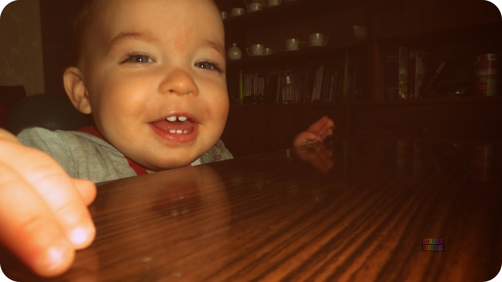 Dziś udało mi się złapać parę innych min. Ja pokazuję swoją, Szymon robi swoją i tak się papugujemy. Robimy to także z lustrem, które kładę na podłodze i wtedy patrzymy się na odbicia i robimy "groźne" miny.